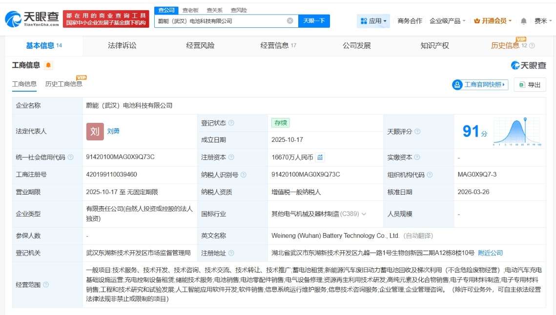 每经AI快讯,天眼查App显示,近日,蔚能(武汉)电池科技有限公司发生工商变更,原股东武汉蔚能电池资产有限公司退出,新增中信证券(600030)为全资股东,同时,赖晓明卸任法定代表人、董事、经理,刘勇接任法定代表人、董事,王洲接任经理。该公司成立于2025年10月,经营范围包括蓄电池租赁、新能源汽车废旧动力蓄电池回收及梯次利用、电动汽车充电基础设施运营等。
