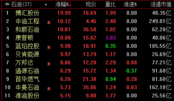 具体来看,石油板块走高,博汇股份、和顺石油等6股涨停,超11股涨逾5%。