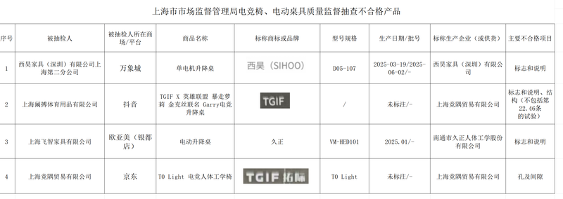 不合格名单显示,1批次标称西昊家具(深圳)有限公司生产的“西昊”牌单电机升降桌(型号规格D05-107;生产日期/批号2025-03-19/2025-06-02/-)、1批次标称南通市久正人体工学股份有限公司生产的“久正”牌电动升降桌(型号规格VM-HED101;生产日期/批号2025.01/-)标志和说明不合格。另有1批次标称上海竞隅贸易有限公司生产的“TGIF X 英雄联盟暴走萝莉金克丝联名 Garry电竞升降桌”标志和说明、结构不合格,该公司生产的1批次“T0 Light 电竞人体工学椅”(型号规格T0 Light)孔及间隙不合格。