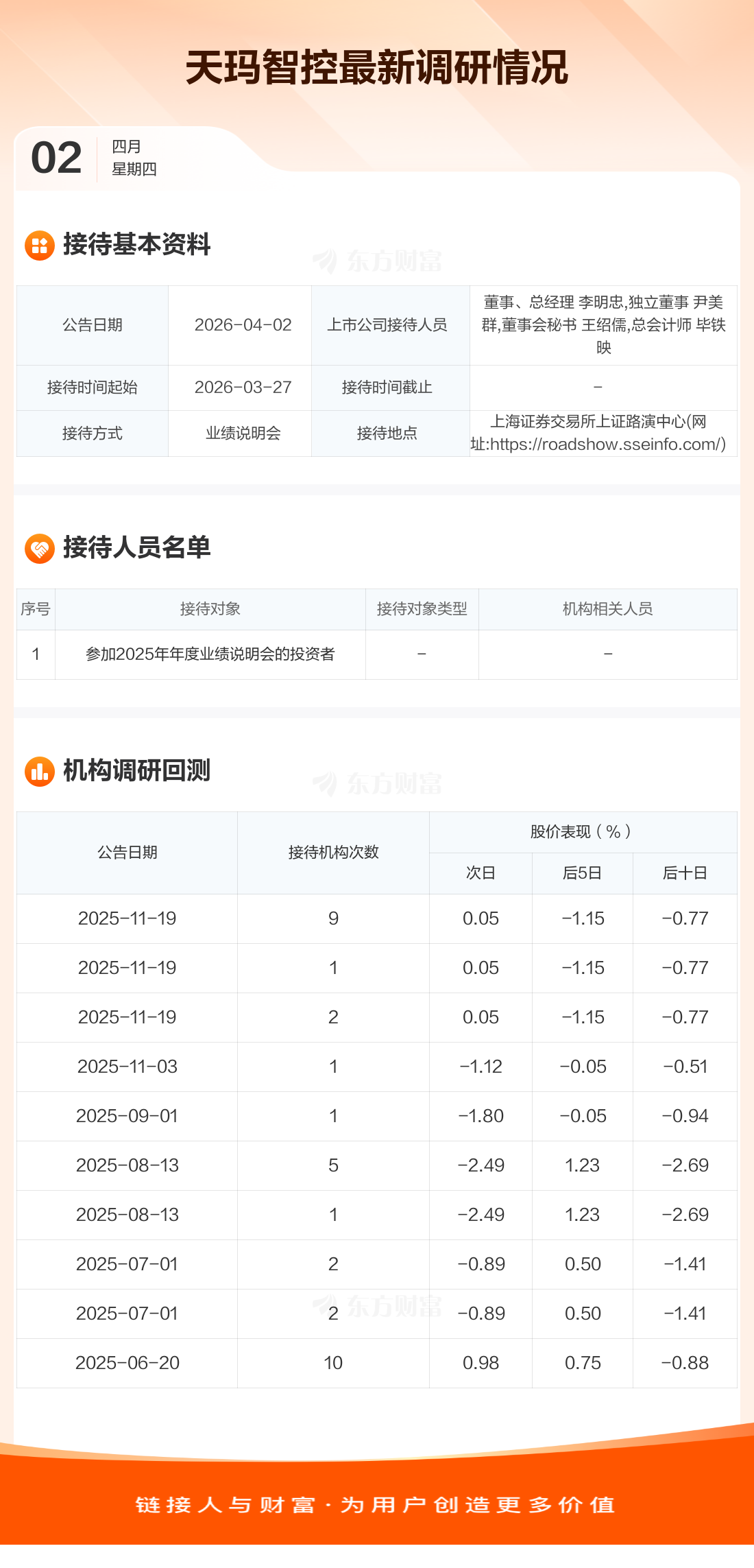 天玛智控4月2日公告称,3月27日接待参加2025年年度业绩说明会的投资者等1家机构调研。接待人员包括董事、总经理 李明忠,独立董事 尹美群,董事会秘书 王绍儒,总会计师 毕铁映。