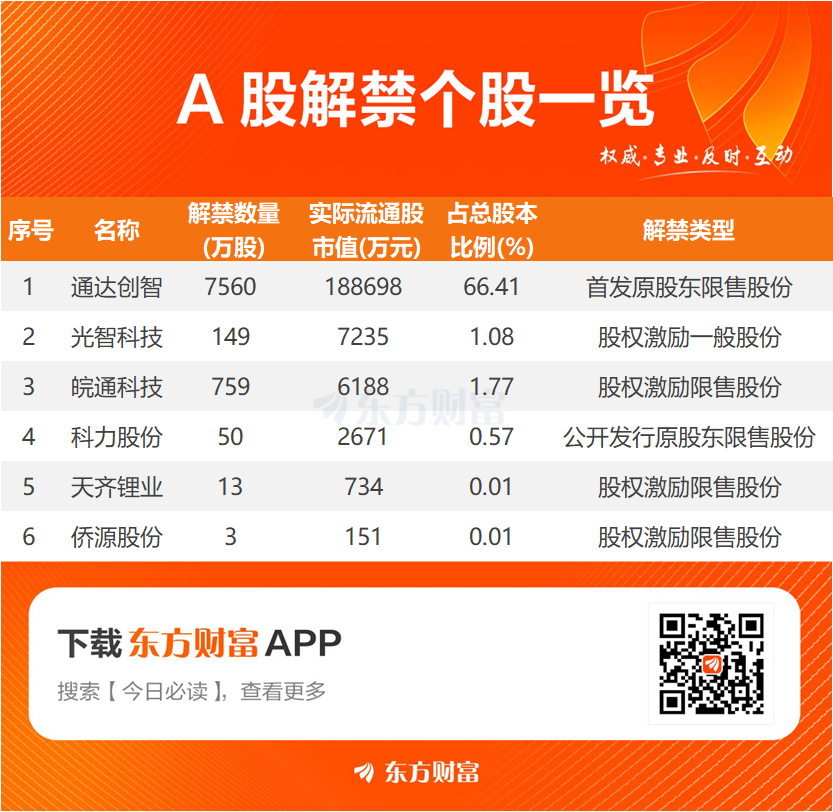 【明日解禁】明日6股解禁 通达创智、光智科技解禁市值居前