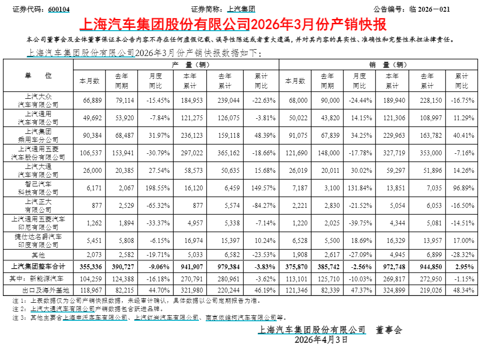 上汽集团:3月整车销量同比下降2.56%