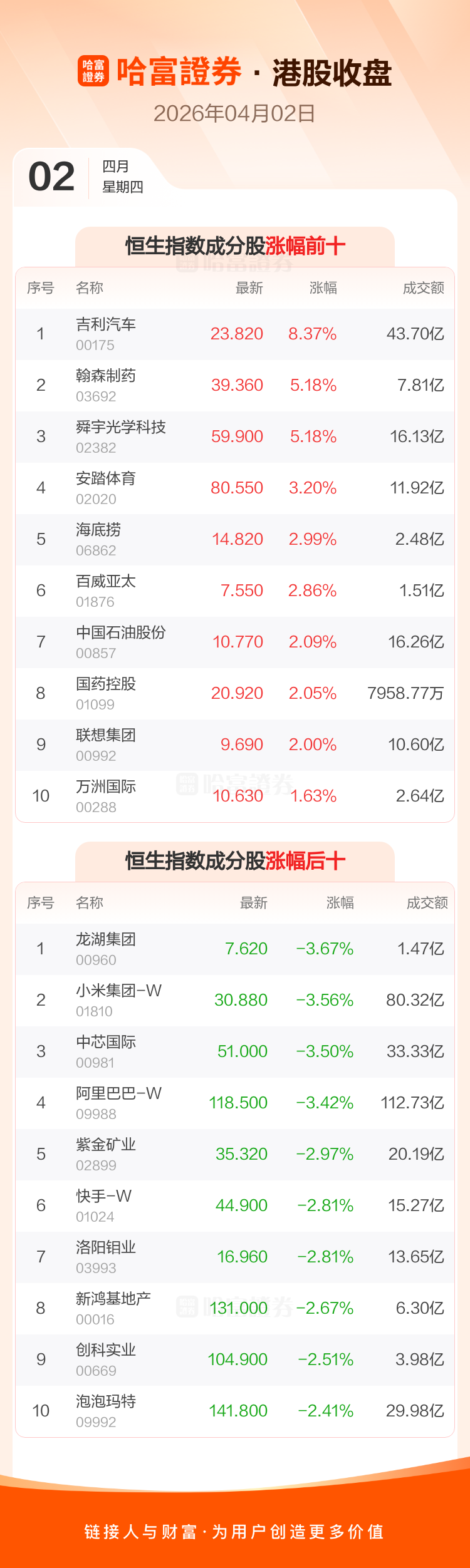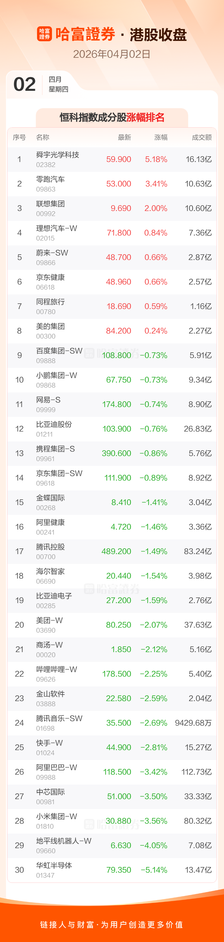 港股4月2日收盘走低 ,恒生指数收报25116.53点,跌177.5点,跌幅0.7%;恒生科技指数收报4679.1点,跌77.35点,跌幅1.63%。恒生指数成分股中吉利汽车、翰森制药、舜宇光学科技涨幅居前,龙湖集团、小米集团-W、中芯国际跌幅靠前。恒生科技指数成分股中舜宇光学科技、零跑汽车、联想集团涨幅居前,华虹半导体、地平线机器人-W、小米集团-W跌幅靠前。