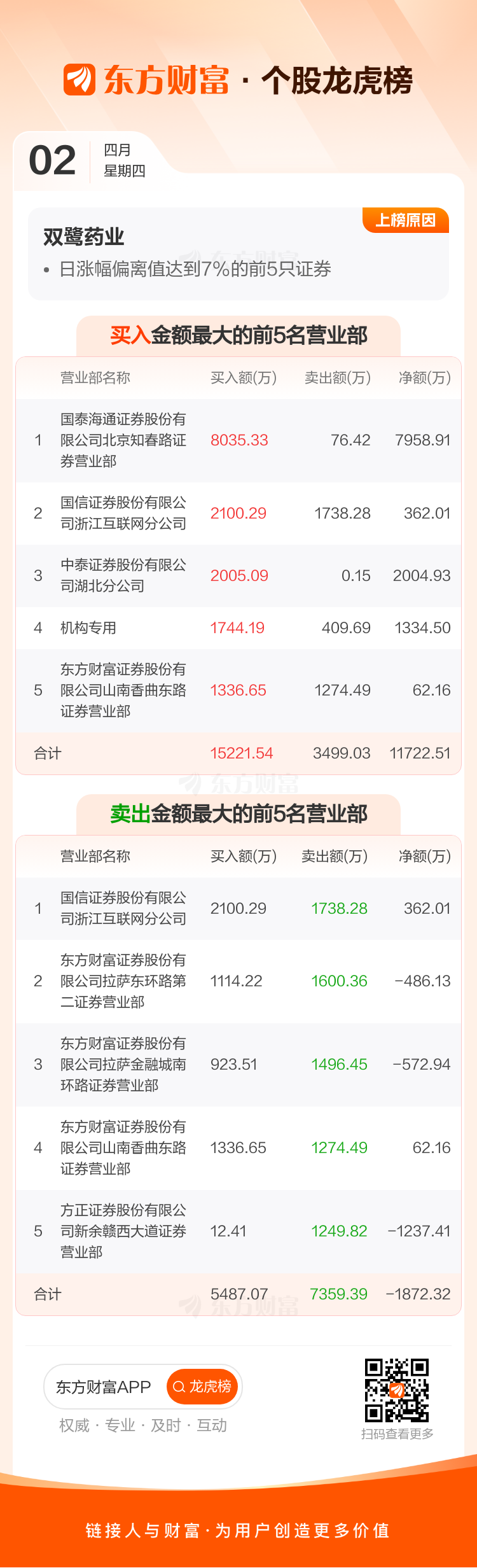 双鹭药业(002038)龙虎榜数据(04-02)