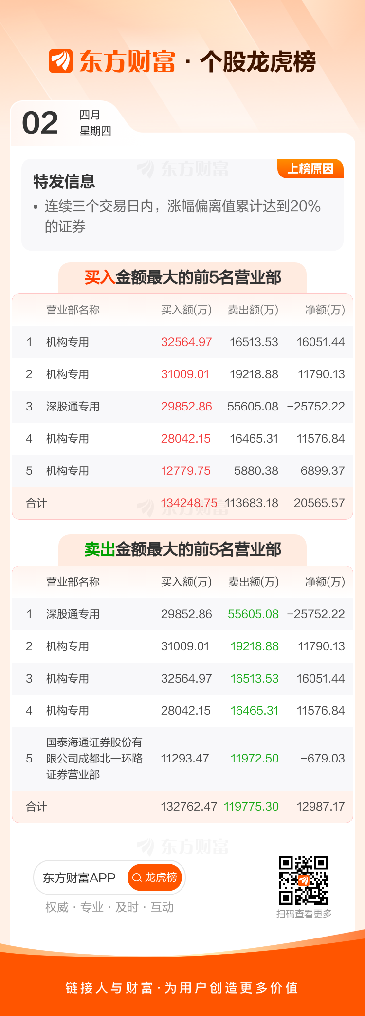 交易所2026年4月2日公布的交易公开信息显示,特发信息因成为连续三个交易日内,涨幅偏离值累计达到20%的证券上榜。特发信息当日收报19.37元,涨跌幅4.99%,换手率22.75%,成交额38.75亿。异常期间3月31日至4月2日,期间涨幅19.72%,累计偏离值21.39%,区间成交额101.70亿。