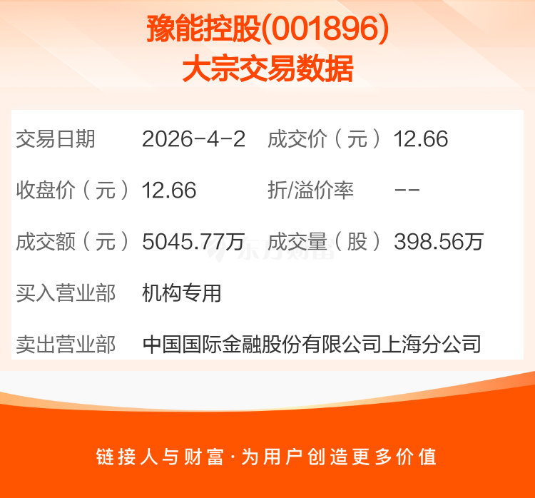 2026年4月2日,豫能控股发生1笔大宗交易,共成交398.56万股,成交金额5045.77万元,占其流通市值比例为0.26%。