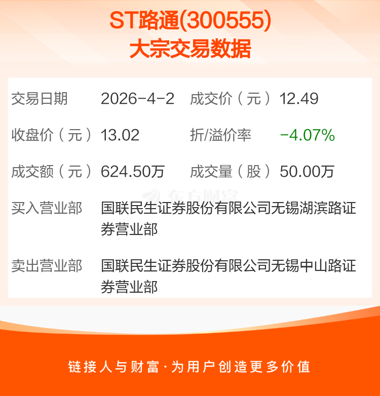 2026年4月2日,ST路通发生1笔大宗交易,共成交50.00万股,成交金额624.50万元,占其流通市值比例为0.24%。