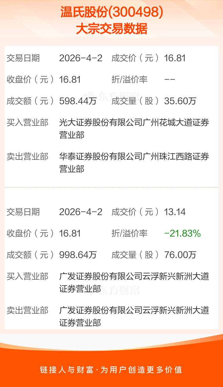 2026年4月2日,温氏股份发生2笔大宗交易,共成交111.60万股,成交金额1597.08万元,占其流通市值比例为0.02%。