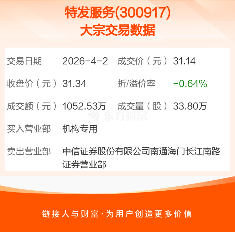 2026年4月2日,特发服务发生1笔大宗交易,共成交33.80万股,成交金额1052.53万元,占其流通市值比例为0.20%。