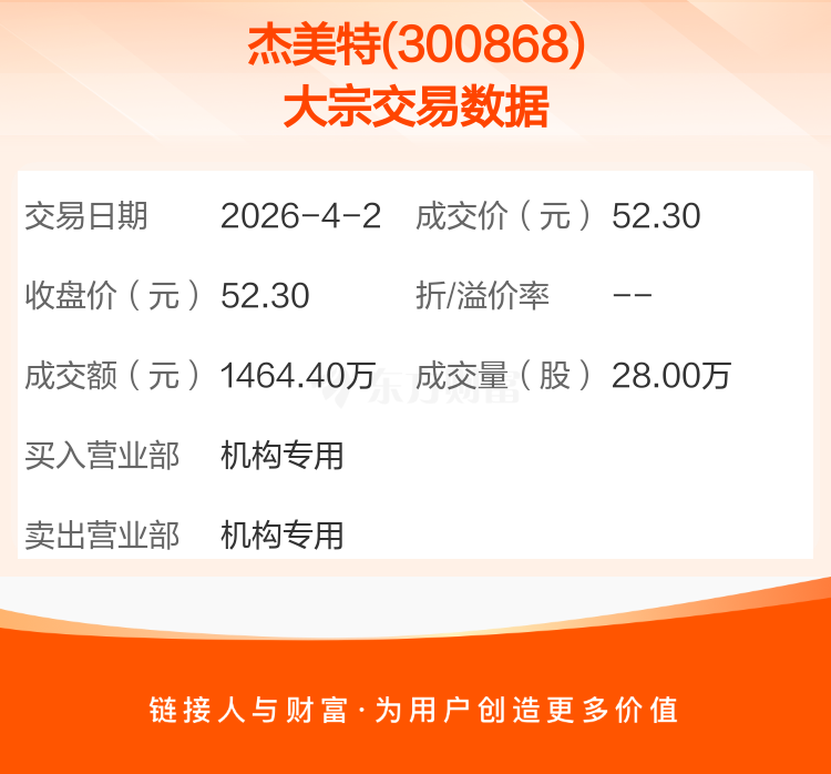 2026年4月2日,杰美特发生1笔大宗交易,共成交28.00万股,成交金额1464.40万元,占其流通市值比例为0.35%。