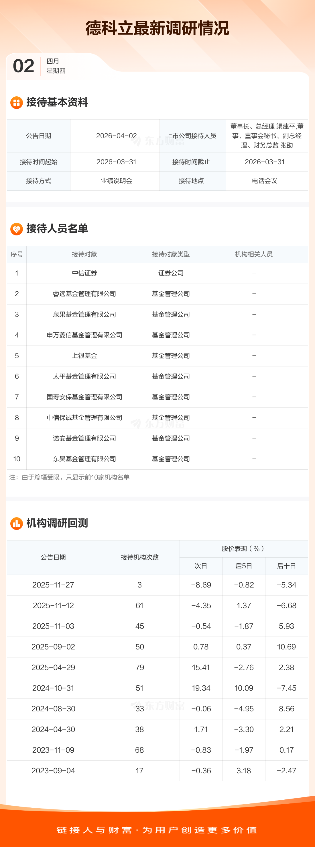 德科立4月2日公告称,3月31日接待中信证券等91家机构调研。接待人员包括董事长、总经理 渠建平,董事、董事会秘书、副总经理、财务总监 张劭。