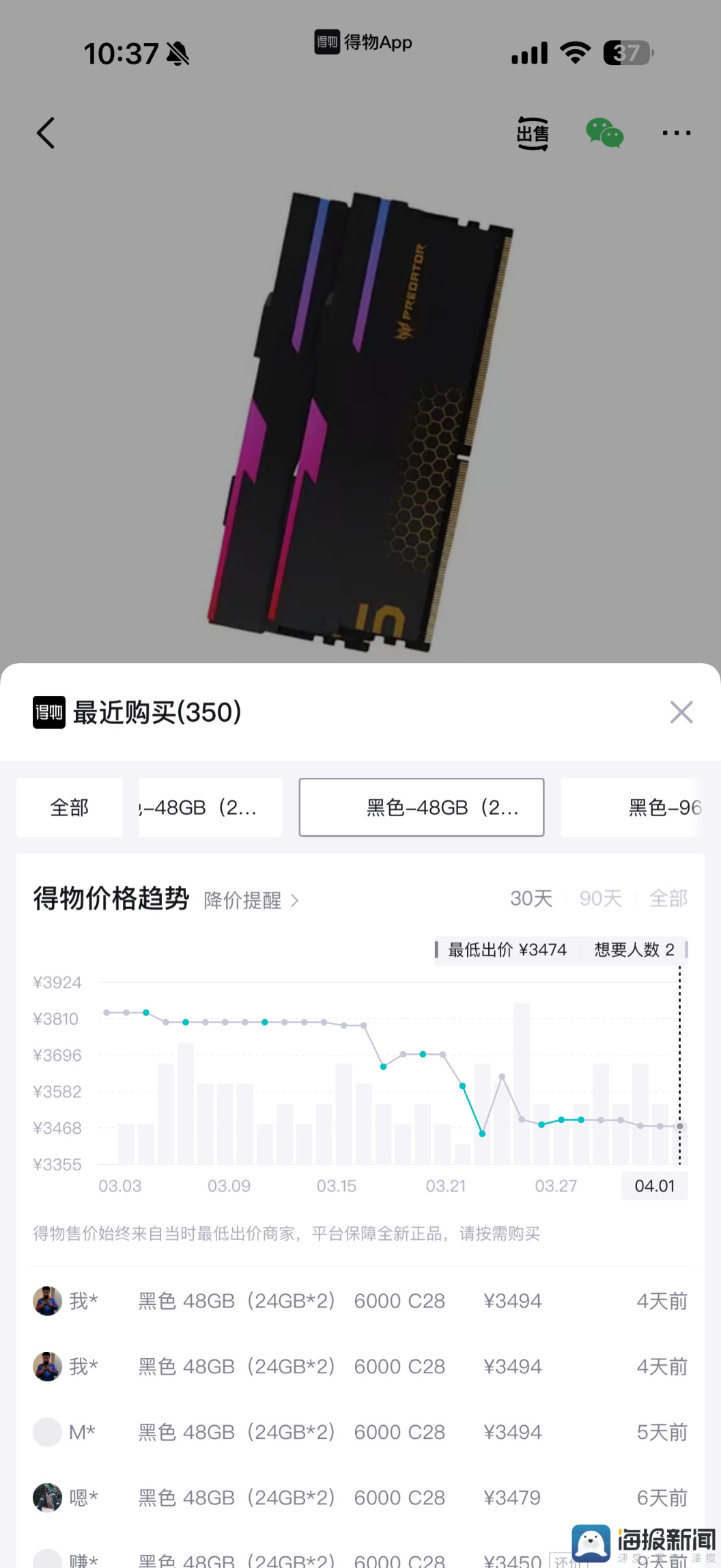 得物App数据显示,2026年以来,宏碁掠夺者DDR5(48GB)内存条市场成交价由峰值的4019元下跌至当前的3494元,下跌了525元(下跌近13%),近半个月以来,该产品市场成交价甚至在3月20日、21日甚至出现了连续2天,每天价格下跌100元的情形。