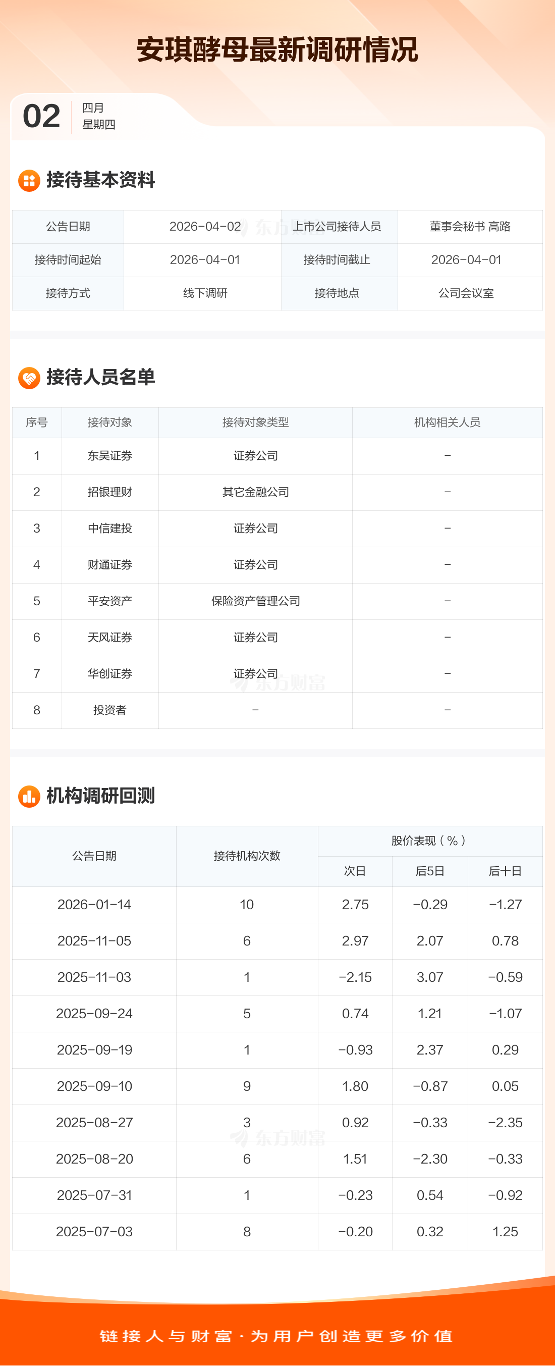 安琪酵母4月2日公告称,4月1日接待东吴证券等8家机构调研。接待人员包括董事会秘书 高路。
