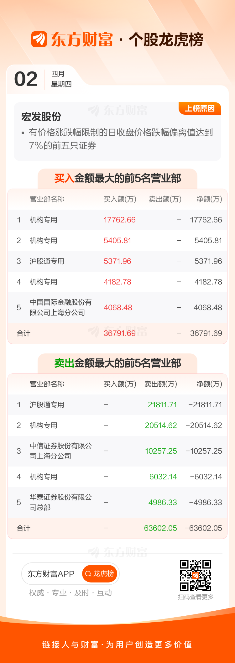 交易所2026年4月2日公布的交易公开信息显示,宏发股份因成为有价格涨跌幅限制的日收盘价格跌幅偏离值达到7%的前五只证券上榜。宏发股份当日收报25.35元,涨跌幅-9.95%,偏离值-9.21%,换手率4.43%,成交额17.60亿。