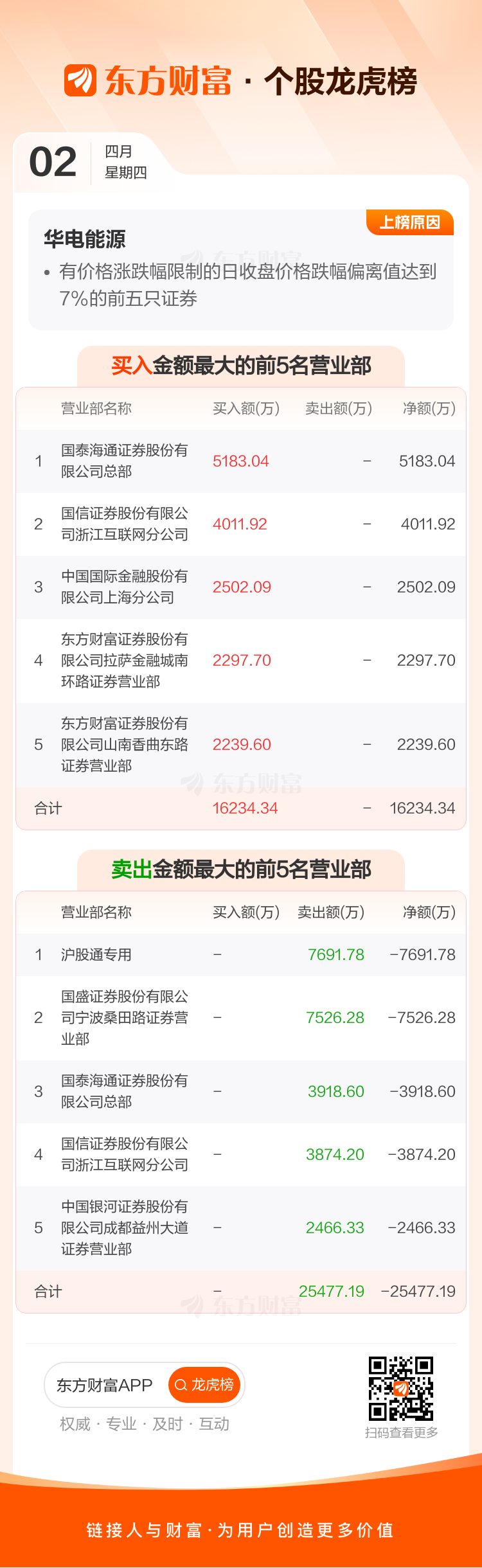 交易所2026年4月2日公布的交易公开信息显示,华电能源因成为有价格涨跌幅限制的日收盘价格跌幅偏离值达到7%的前五只证券上榜。华电能源当日收报5.32元,涨跌幅-9.98%,偏离值-9.24%,换手率5.53%,成交额23.16亿。