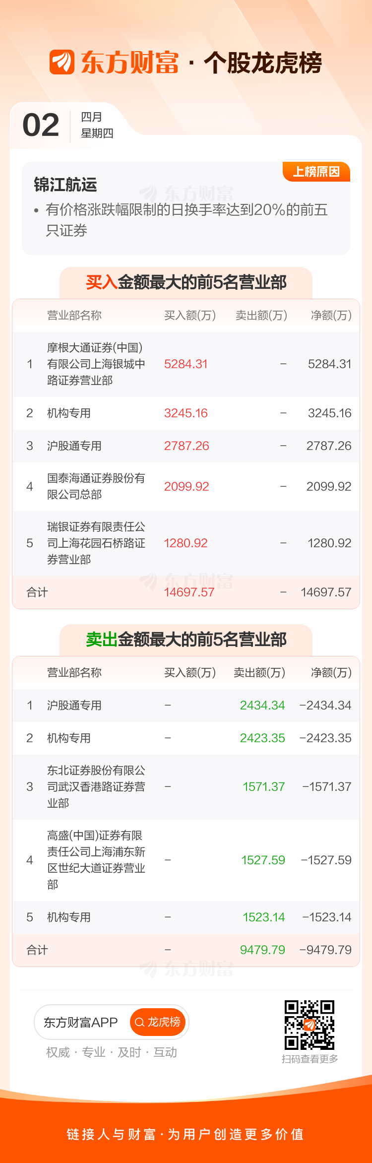 交易所2026年4月2日公布的交易公开信息显示,锦江航运因成为有价格涨跌幅限制的日换手率达到20%的前五只证券上榜。锦江航运当日收报13.16元,涨跌幅1.78%,偏离值28.02%,换手率28.02%,成交额7.13亿。