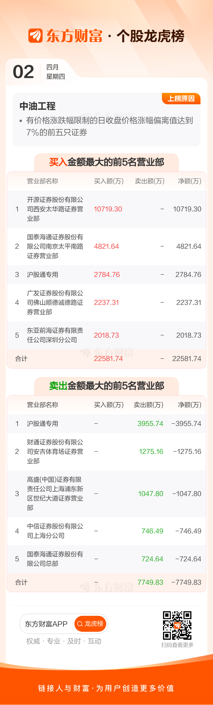 交易所2026年4月2日公布的交易公开信息显示,中油工程因成为有价格涨跌幅限制的日收盘价格涨幅偏离值达到7%的前五只证券上榜。中油工程当日收报4.46元,涨跌幅10.12%,偏离值10.86%,换手率3.85%,成交额9.29亿。