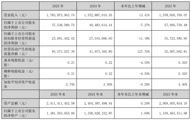 截至2025年末,公司资产总额241,141.15万元,较上年度末增长0.29%,归属于上市公司股东净资产为138,159.37万元,较上年度末增长1.69%。
