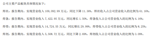 年报显示,传统主业疲软成为拖累公司业绩的重要因素。报告期内,公司营收占比达61.16%的焊丝业务实现营收10.91亿元,同比下降11.36%。