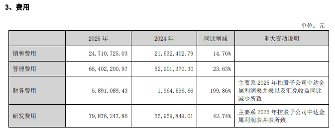 费用方面,公司财务费用、管理费用、销售费用、研发费用均有不同程度增长。其中,财务费用大增199.86%,主要系2025年控股子公司中达金属利润表并表以及汇兑收益同比减少所致;研发费用大增42.74%,主要系2025年控股子公司中达金属利润表并表所致;销售费用增长14.76%,管理费用增长23.63%。