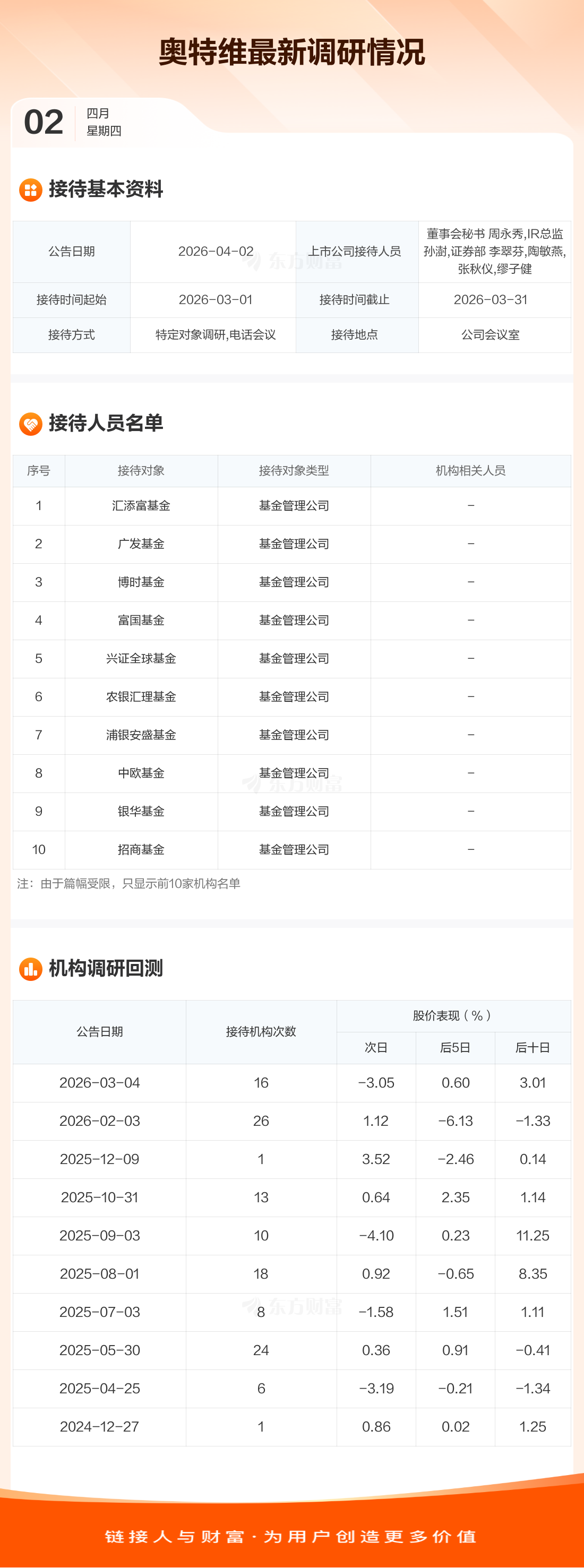 奥特维4月2日公告称,3月1日至3月31日接待汇添富基金等12家机构调研。接待人员包括董事会秘书 周永秀,IR总监 孙澍,证券部 李翠芬,陶敏燕,张秋仪,缪子健。