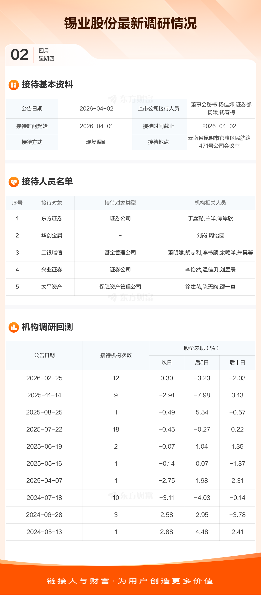 锡业股份4月2日公告称,4月1日至4月2日接待东方证券等5家机构调研。接待人员包括董事会秘书 杨佳炜,证券部 杨媛,钱春梅。