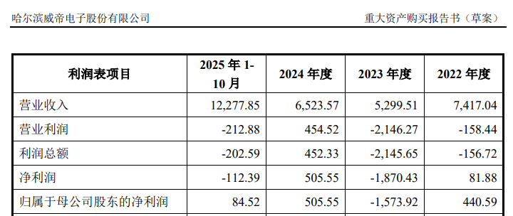 不仅如此,根据公告披露,目前威帝股份的主营业务——汽车电子控制产品正面临严峻挑战。公告披露的主要财务数据显示,2022年至2024年,威帝股份的营业收入分别为7,417.04万元、5,299.51万元和6,523.57万元,始终在低水平徘徊。尽管2025年前10个月因增加了乘用车电子产品和光导注塑件业务,营收提升至12,277.85万元,但利润表现却令人咋舌。