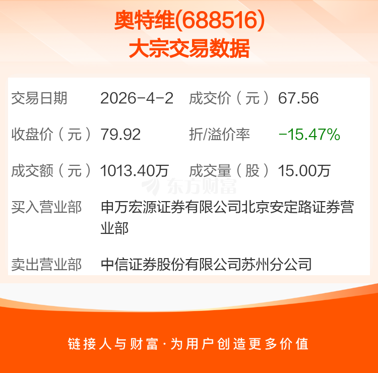 2026年4月2日,奥特维发生1笔大宗交易,共成交15.00万股,成交金额1013.40万元,占其流通市值比例为0.04%。