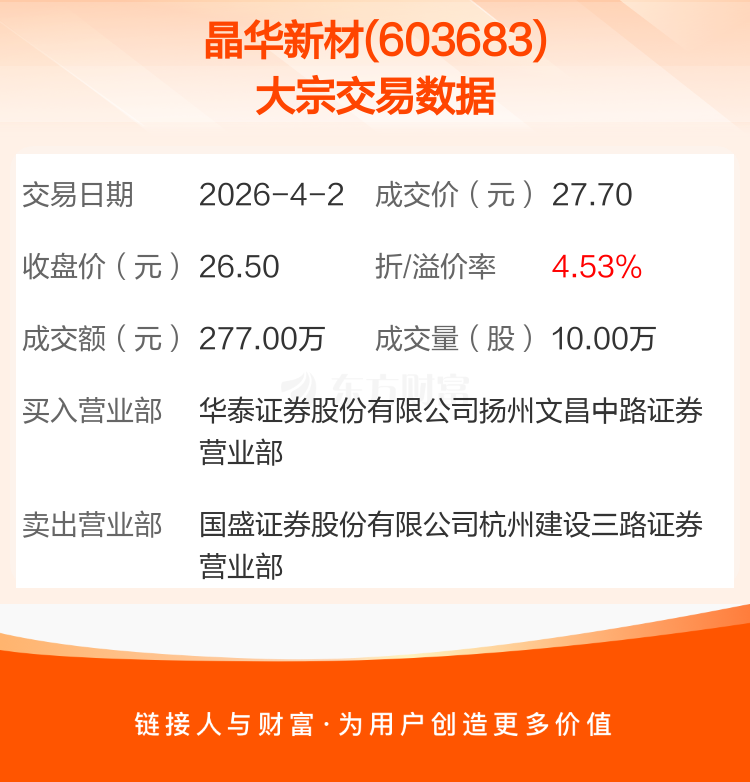 2026年4月2日,晶华新材发生1笔大宗交易,共成交10.00万股,成交金额277.00万元,占其流通市值比例为0.04%。