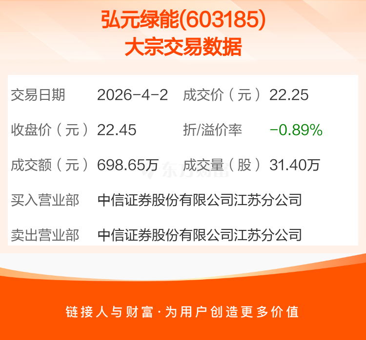 2026年4月2日,弘元绿能发生1笔大宗交易,共成交31.40万股,成交金额698.65万元,占其流通市值比例为0.05%。