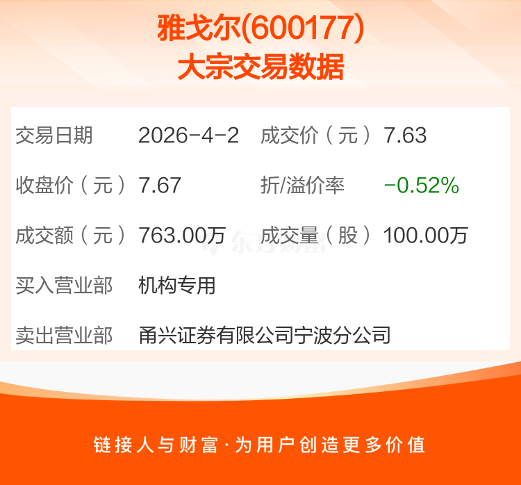 2026年4月2日,雅戈尔发生1笔大宗交易,共成交100.00万股,成交金额763.00万元,占其流通市值比例为0.02%。