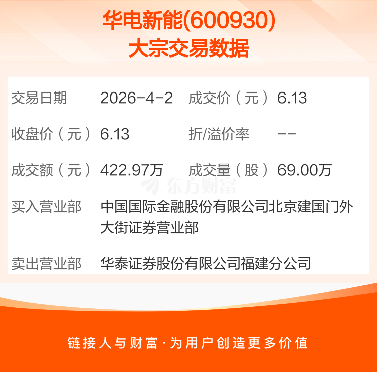 2026年4月2日,华电新能发生1笔大宗交易,共成交69.00万股,成交金额422.97万元,占其流通市值比例为0.02%。