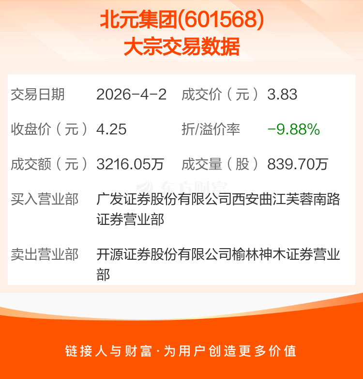 2026年4月2日,北元集团发生1笔大宗交易,共成交839.70万股,成交金额3216.05万元,占其流通市值比例为0.19%。