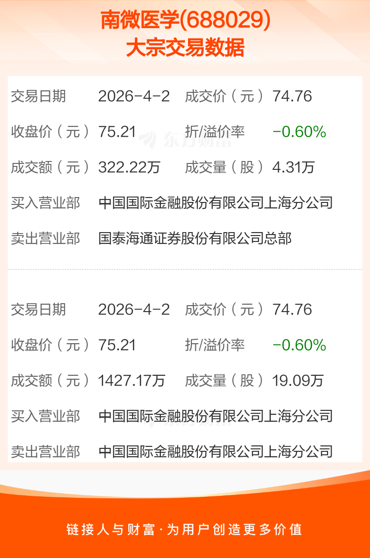 2026年4月2日,南微医学发生2笔大宗交易,共成交23.40万股,成交金额1749.39万元,占其流通市值比例为0.12%。
