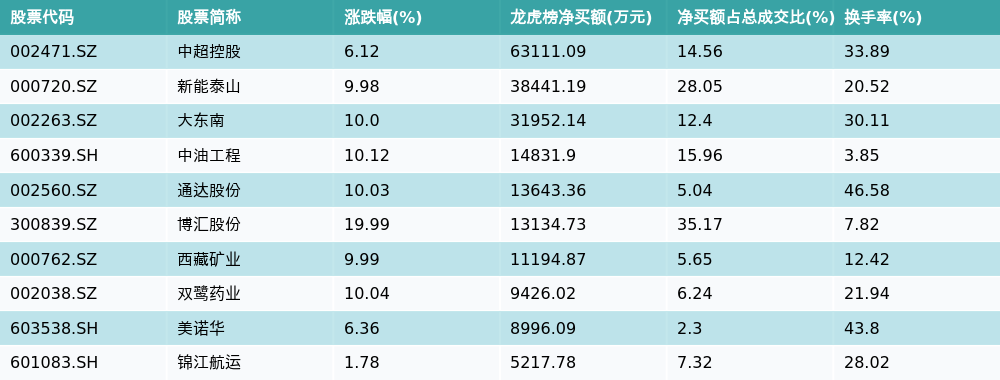 南财智讯4月2日电,盘后数据显示,因当日异动登上龙虎榜的个股中,资金净买入最多的前三位分别是中超控股(002471.SZ)、新能泰山(000720.SZ)与大东南(002263.SZ)。其中排名第一的中超控股净买额达6.31亿元,占总成交金额的14.56%。中超控股当日收盘上涨6.12%,换手率为33.89%,净买入额前10个股详情见下图: