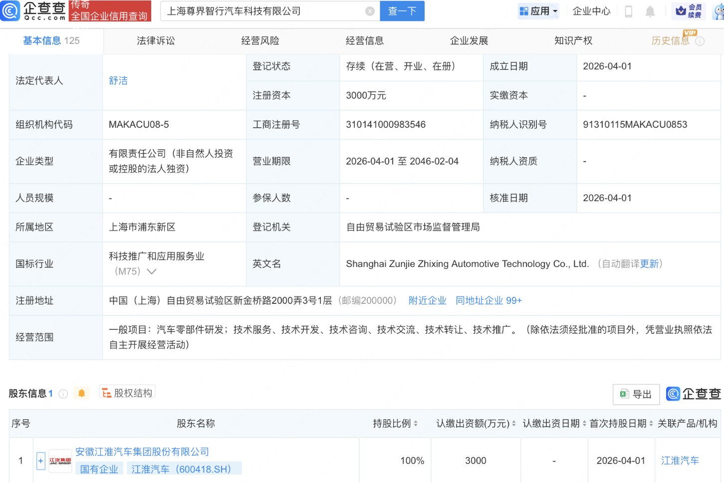 江淮汽车在上海成立尊界智行汽车公司