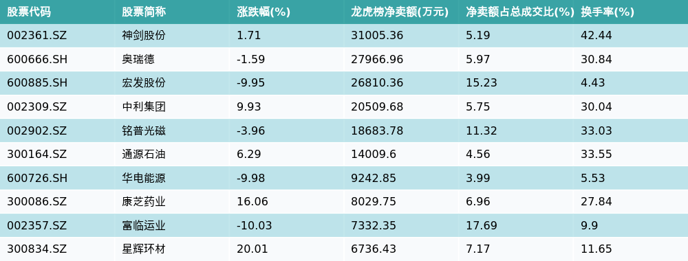 南财智讯4月2日电,盘后数据显示,因当日异动登上龙虎榜的个股中,龙虎榜中资金净流出最多的前三位分别是神剑股份(002361.SZ)、奥瑞德(600666.SH)与宏发股份(600885.SH)。其中排名第一的神剑股份被净卖出3.1亿元,占总成交金额的5.19%。神剑股份收盘上涨1.71%,换手率为42.44%。净卖出额前10个股详情见下图: