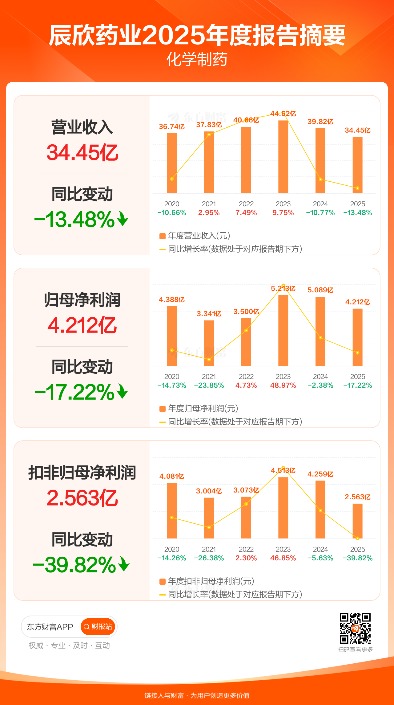 辰欣药业4月3日发布2025年年报显示,公司全年实现营业收入34.45亿元,同比下滑13.48%;归母净利润4.21亿元,同比下滑17.22%;扣非归母净利润2.56亿元,同比下滑39.82%。
