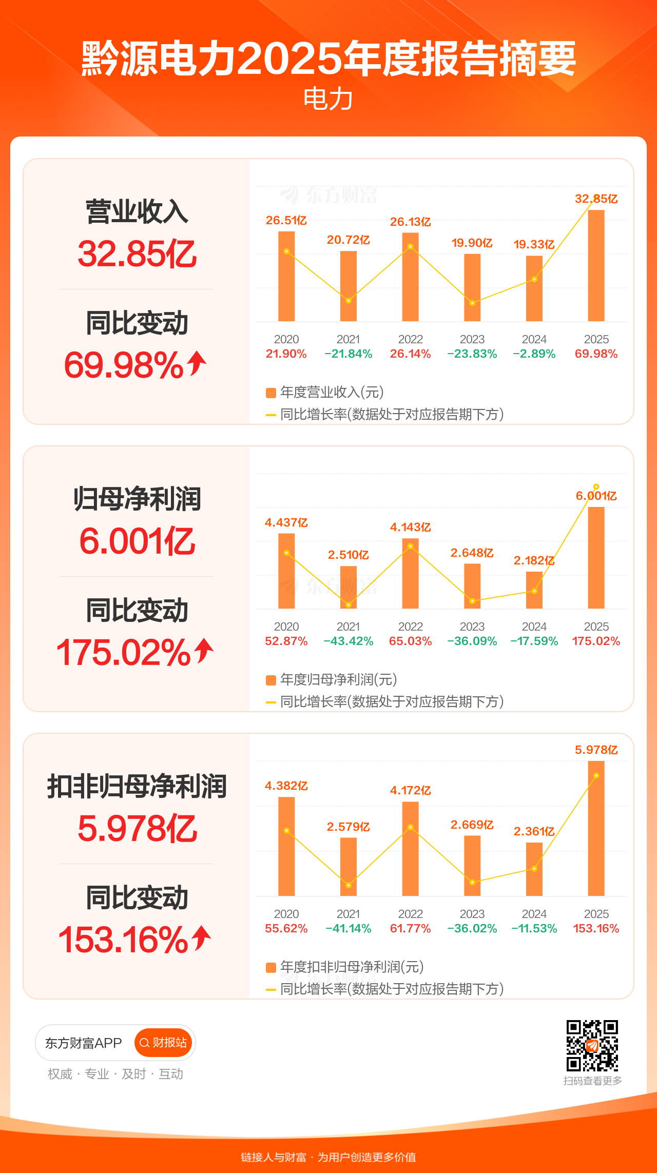 黔源电力4月3日发布2025年年报显示,公司全年实现营业收入32.85亿元,同比增长69.98%;归母净利润6.00亿元,同比增长175.02%;扣非归母净利润5.98亿元,同比增长153.16%。