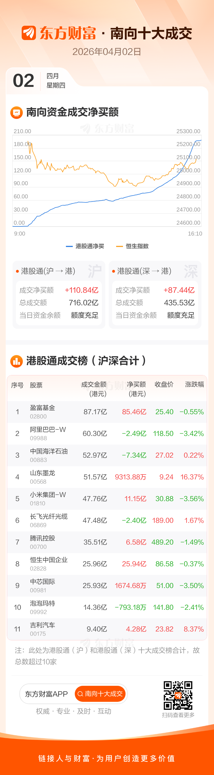 4月2日南向资金净买逾198亿港元,逾85亿抢筹盈富基金