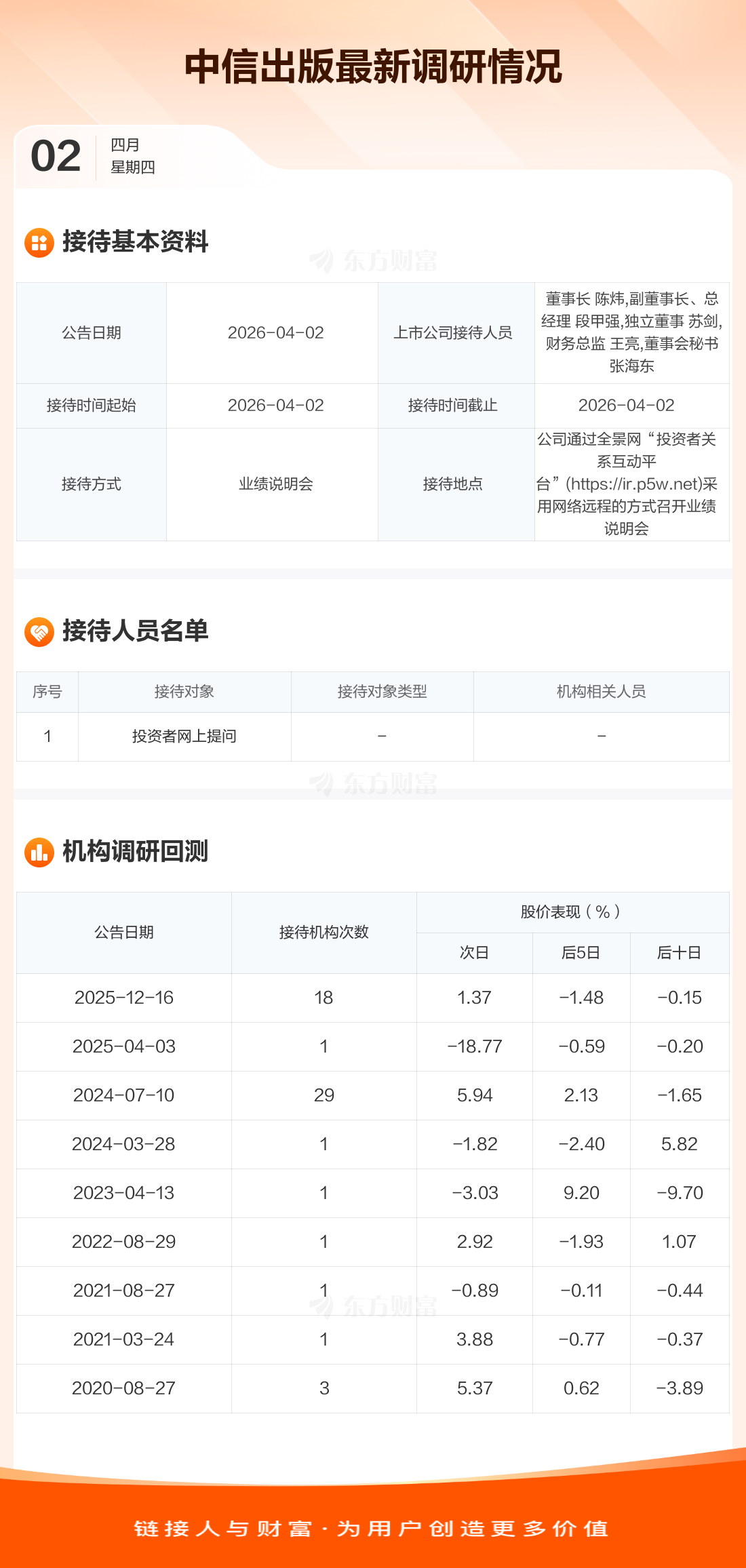 中信出版4月2日公告称,4月2日接待投资者网上提问等1家机构调研。接待人员包括董事长 陈炜,副董事长、总经理 段甲强,独立董事 苏剑,财务总监 王亮,董事会秘书 张海东。