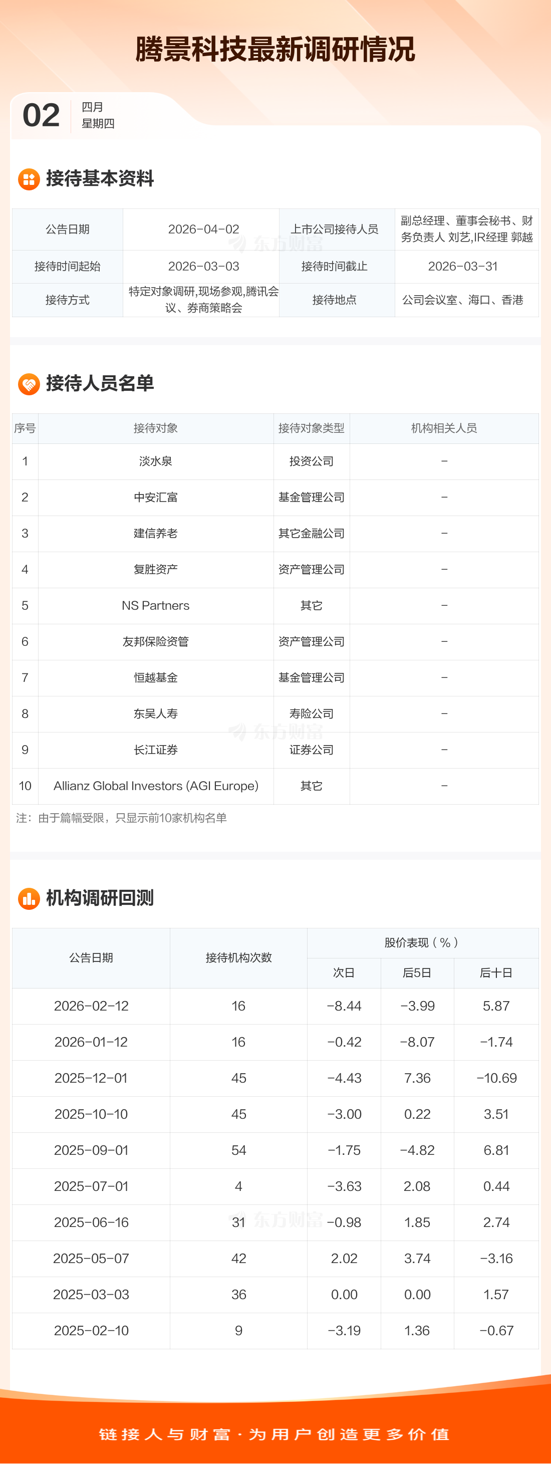 腾景科技4月2日公告称,3月3日至3月31日接待淡水泉等47家机构调研。接待人员包括副总经理、董事会秘书、财务负责人 刘艺,IR经理 郭越。
