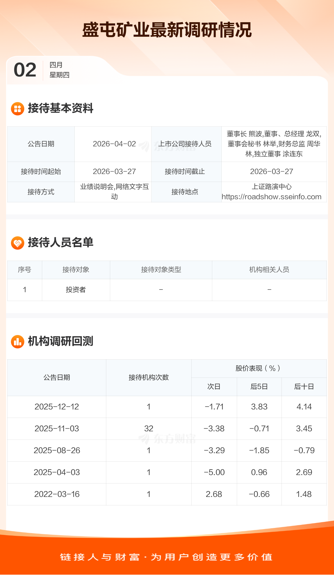 盛屯矿业4月2日公告称,3月27日接待投资者等1家机构调研。接待人员包括董事长 熊波,董事、总经理 龙双,董事会秘书 林举,财务总监 周华林,独立董事 涂连东。