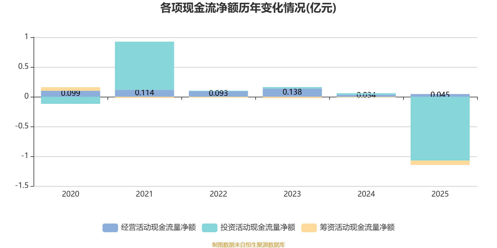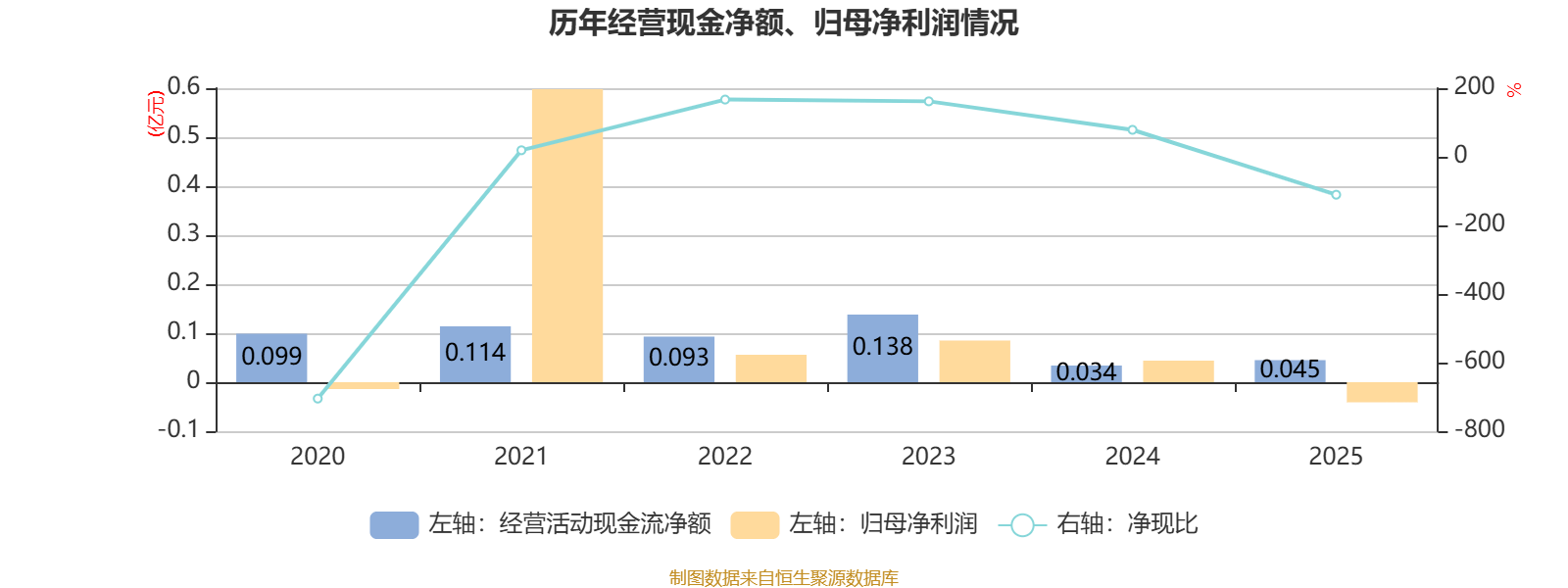 2025年,公司经营活动现金流净额为450.6万元,同比增长31.72%;筹资活动现金流净额-741.2万元,同比减少653.8万元;投资活动现金流净额-1.07亿元,上年同期为248.8万元。