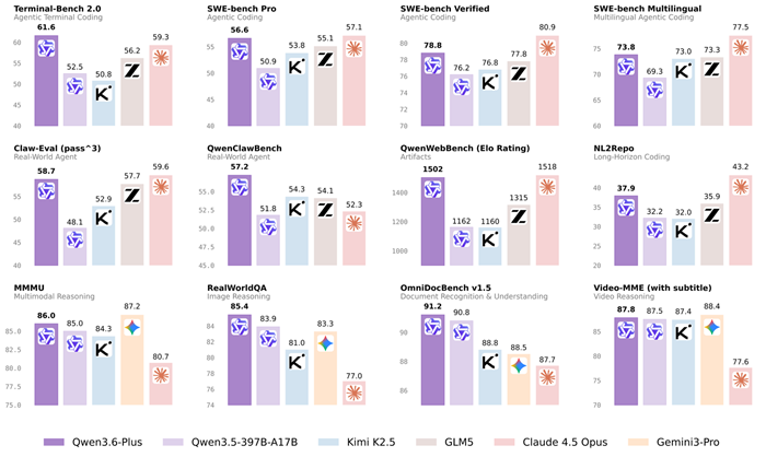 相较于上一代模型,千问3.6整体性能提升明显,尤其是编程Coding能力、智能体Agent能力和工具调用能力都实现了全面跃升。在SWE-bench系列真实编程任务测试、考察终端编程的Terminal-Bench2.0、长程编程任务NL2Repo,以及Claw-Eval、QwenClawBench等真实世界Agent能力评测中,Qwen3.6-Plus表现可完全匹敌Claude Opus4.5,并显著超越了2倍乃至3倍其参数的GLM-5、Kimi-K2.5等国产模型。