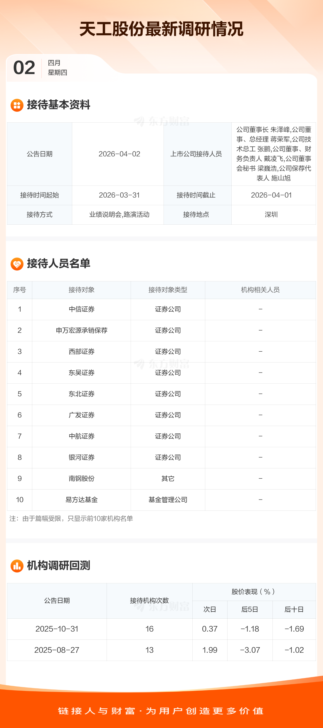 天工股份4月2日公告称,3月31日至4月1日接待中信证券等37家机构调研。接待人员包括公司董事长 朱泽峰,公司董事、总经理 蒋荣军,公司技术总工 张鹏,公司董事、财务负责人 戴凌飞,公司董事会秘书 梁巍浩,公司保荐代表人 施山旭。
