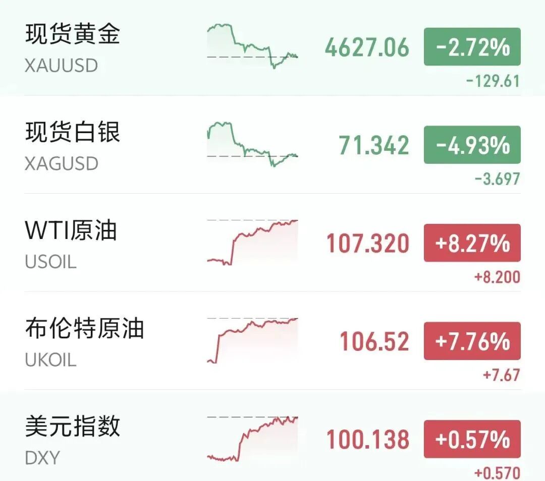 贵金属继续走低,现货黄金跌幅收窄,一度跌破4600美元/盎司,现货白银跌近5%,国际油价直线飙涨,WTI原油飙升8%,站上107美元,布伦特原油涨幅超7%。
