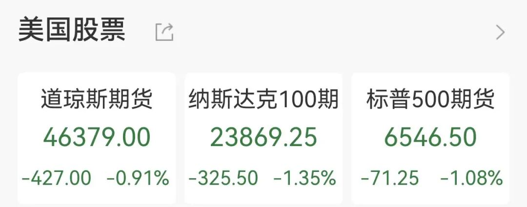 美股盘前三大股指期货集体跳水,道琼斯指数期货跌近1%,跌幅427点,纳斯达克指数期货跌1.35%,跌幅325点,标普500指数期货跌超1%。