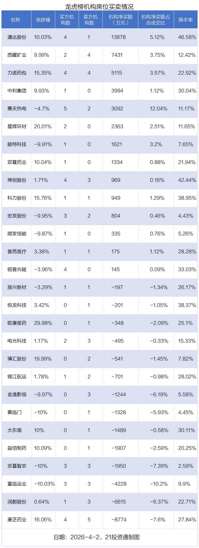 4月2日,28只个股龙虎榜出现了机构的身影,机构合计净买入1.22亿元。具体来看,机构净买入14股,净卖出14股。