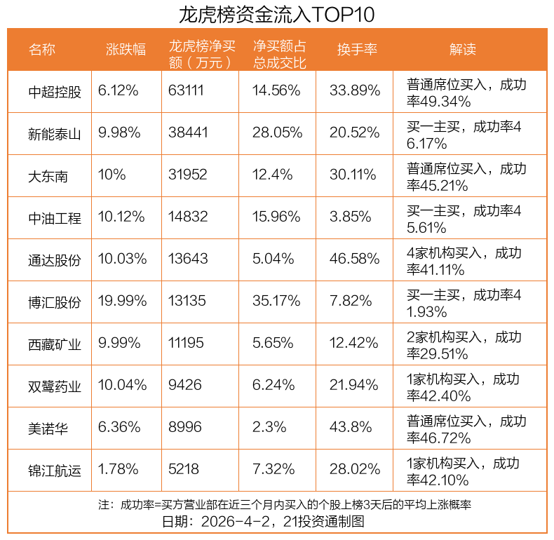 4月2日,上证指数下跌0.74%,深证成指下跌1.6%,创业板指下跌2.31%。盘后龙虎榜数据显示,共有45只个股因当日异动登上龙虎榜,资金净流入最多的是中超控股(002471.SZ),达6.31亿元。